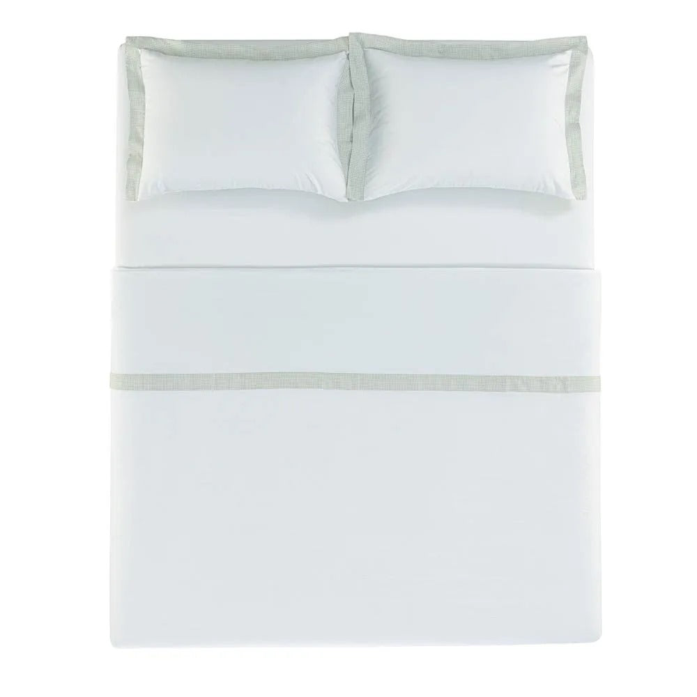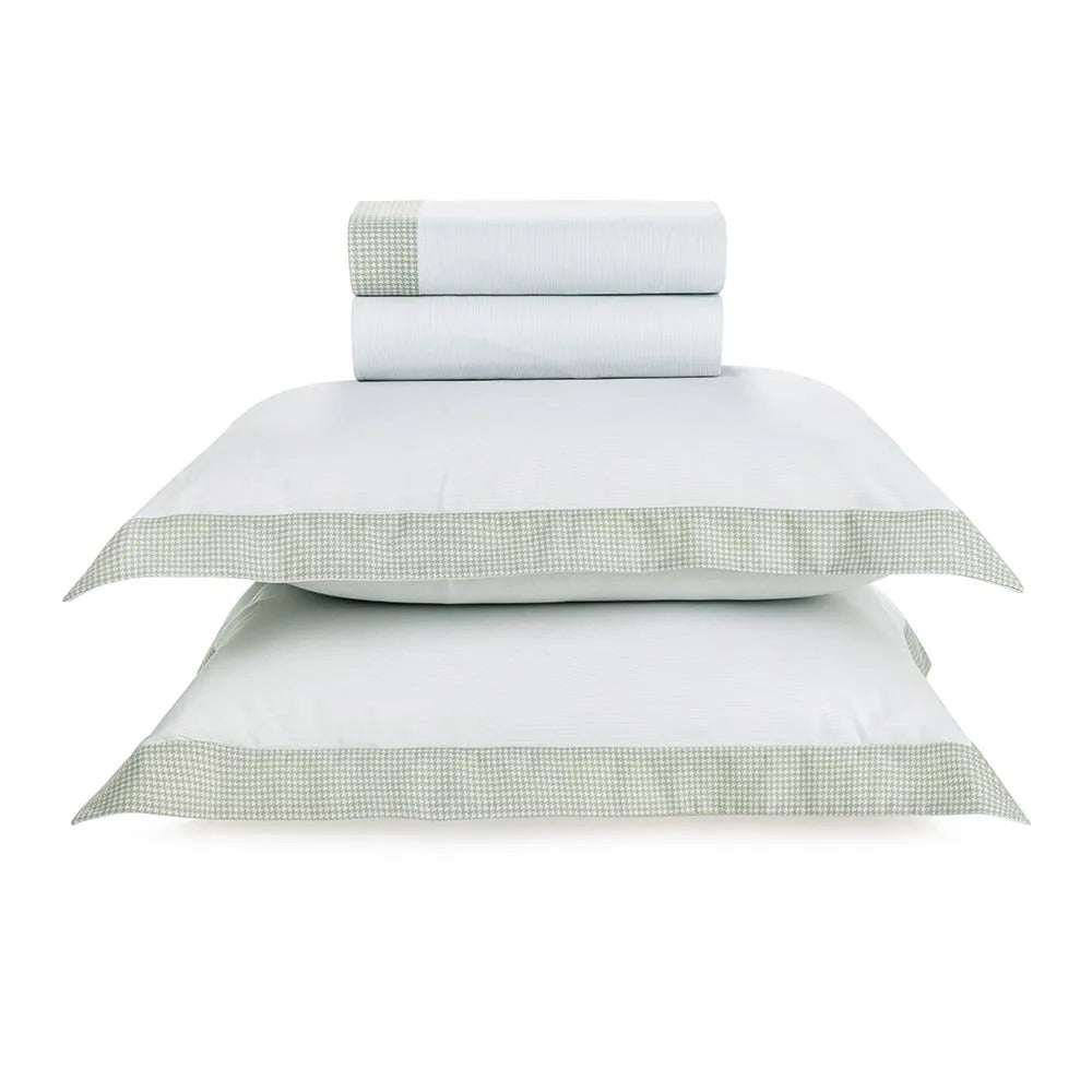 O sobre lençol possui estampa geométrica sutil e pala contrastante em verde, que adiciona charme e requinte à arrumação da cama. O lençol de elástico segue a mesma estampa e garante caimento perfeito ao colchão. As fronhas complementam o conjunto com abas aplicadas de 4cm na cor verde, reforçando o toque de elegância.